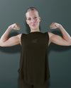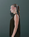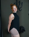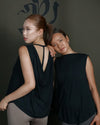 Tailored with a refined front panel and balanced high neckline, its oversized silhouette delivers effortless drape and a full front-body coverage while the back features a sculpted low cowl and structural perpendicular straps.