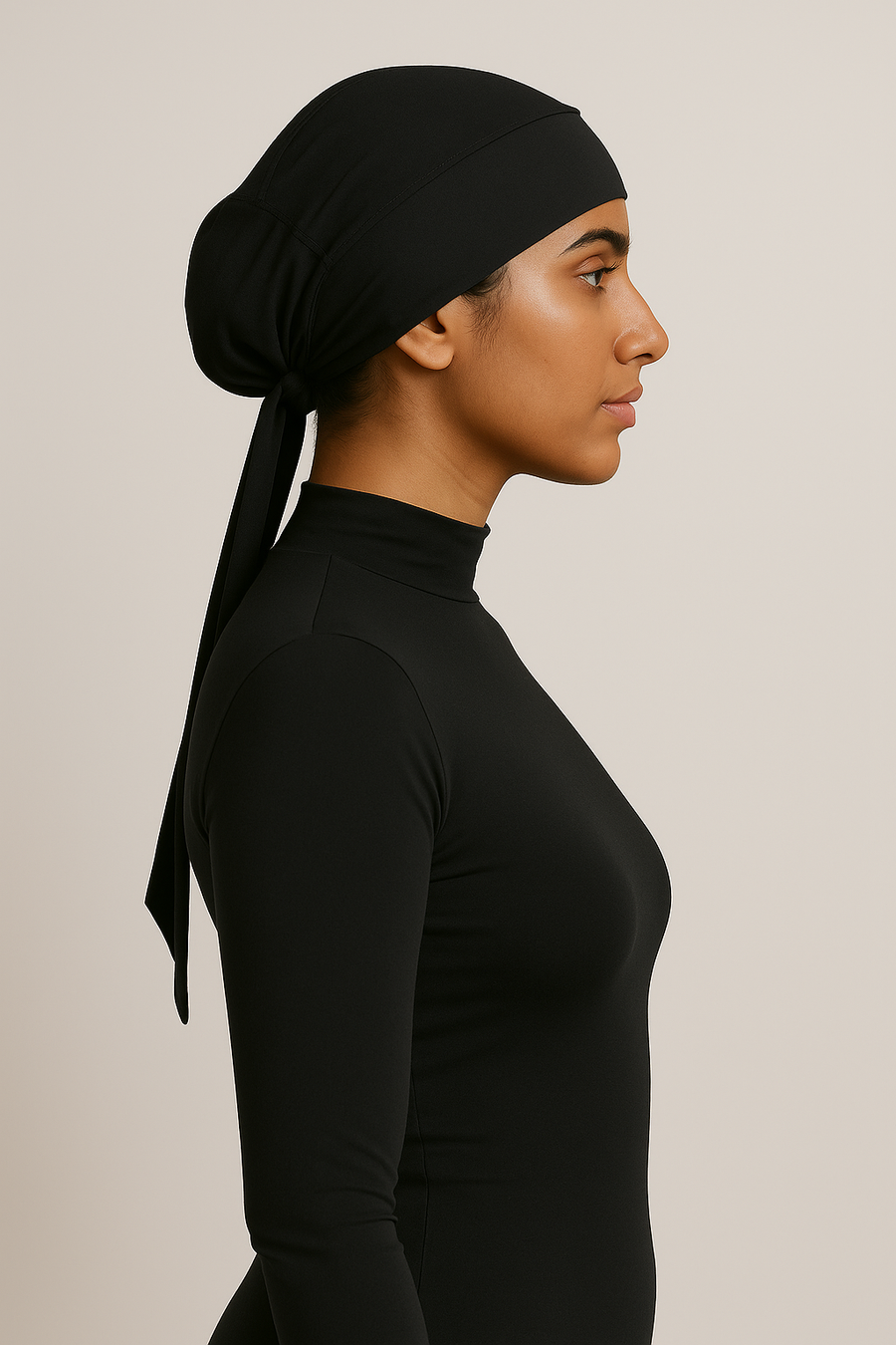Constructed with three-panel shaping and double-lined tie-ins, it secures comfortably beneath hijabs, tie-ins feel soft and ensures stability without compromising ventilation.